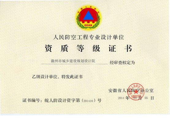 經過建筑室、辦公室和總師室的共同努力,我院申報的人防工程設計乙級資質,于2014年5月5日獲得安徽省人民防空辦公室批準,這標志著我院可以承擔本省范圍內2萬平方米以下人防工程建設項目(不含各類人防指揮所、專業(yè)隊工程、醫(yī)療救護工程、一等人員掩蔽部)主體工程、配套工程及地面附屬設備設施用房的設計業(yè)務。