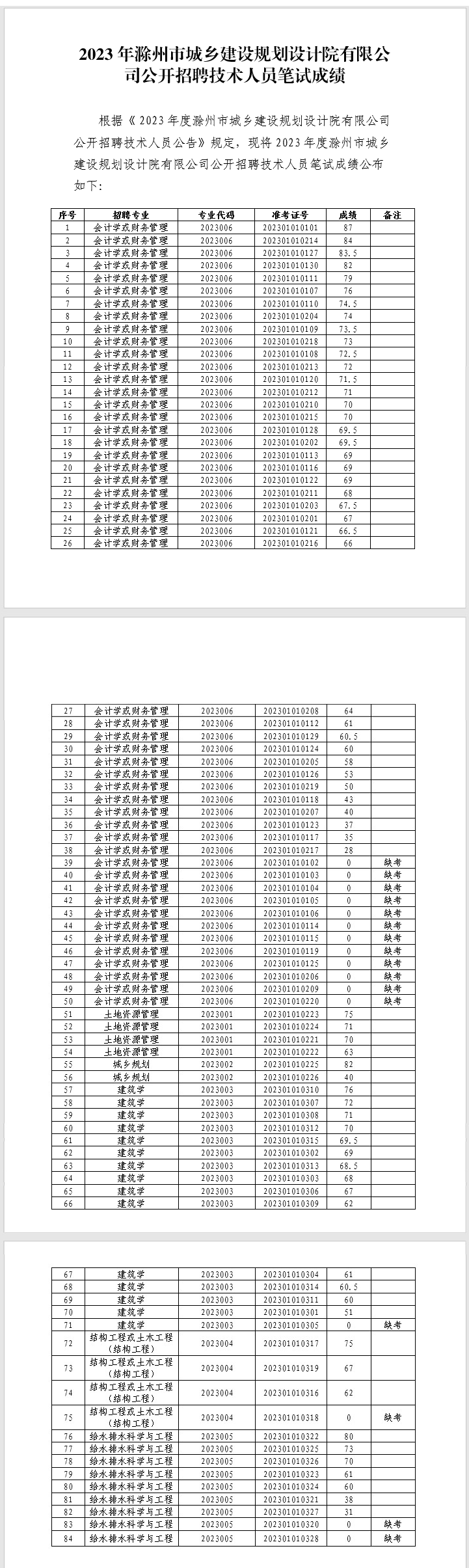2023年滁州市城鄉(xiāng)建設規(guī)劃設計院有限公司公開招聘技術(shù)人員筆試成績