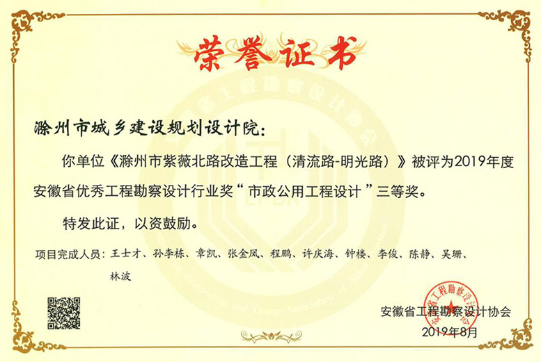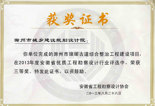 滁州市瑯琊古道綜合整治工程獲獎(jiǎng)證書(shū).
