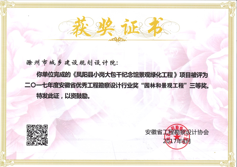 鳳陽(yáng)縣小崗大包干紀(jì)念館景觀綠化工程獲獎(jiǎng)證書(shū)