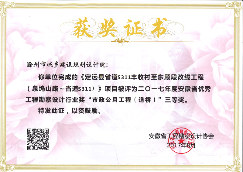 定遠(yuǎn)縣省道S311豐收村至東顧段改線工程獲獎(jiǎng)證書(shū)